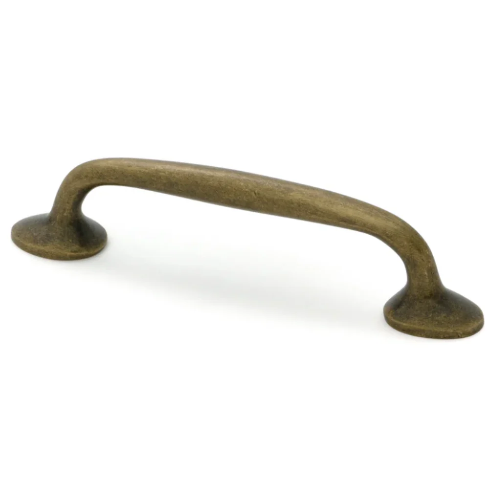 A smooth and elegantly shaped cabinet pull handle crafted from solid brass and then aged to a warm and timeless burnished brass finish (with clear matt lacquer is applied for protection).