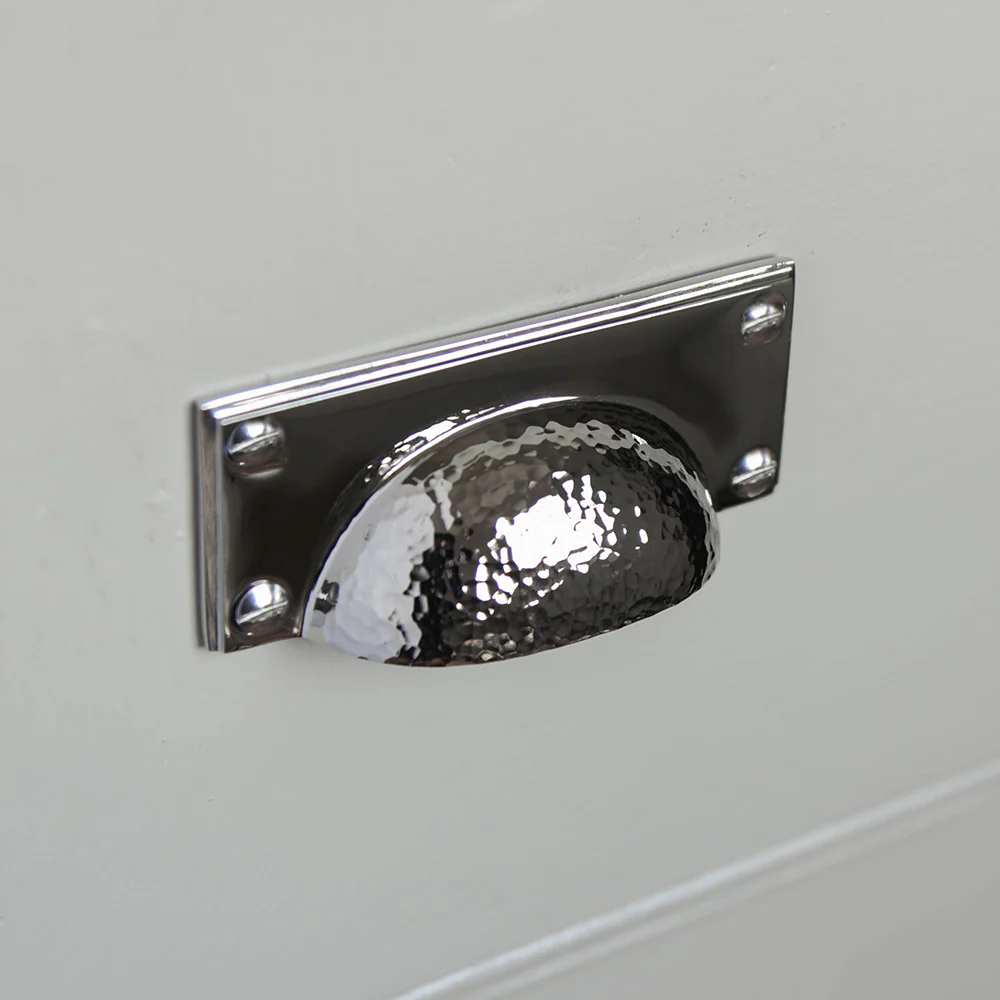 Gorgeous polished nickel drawer pull with a hand-hammered finish that sits against a smooth backplate. This stylish design would look great in a variety of settings, while the textured finish adds a contemporary feel.
