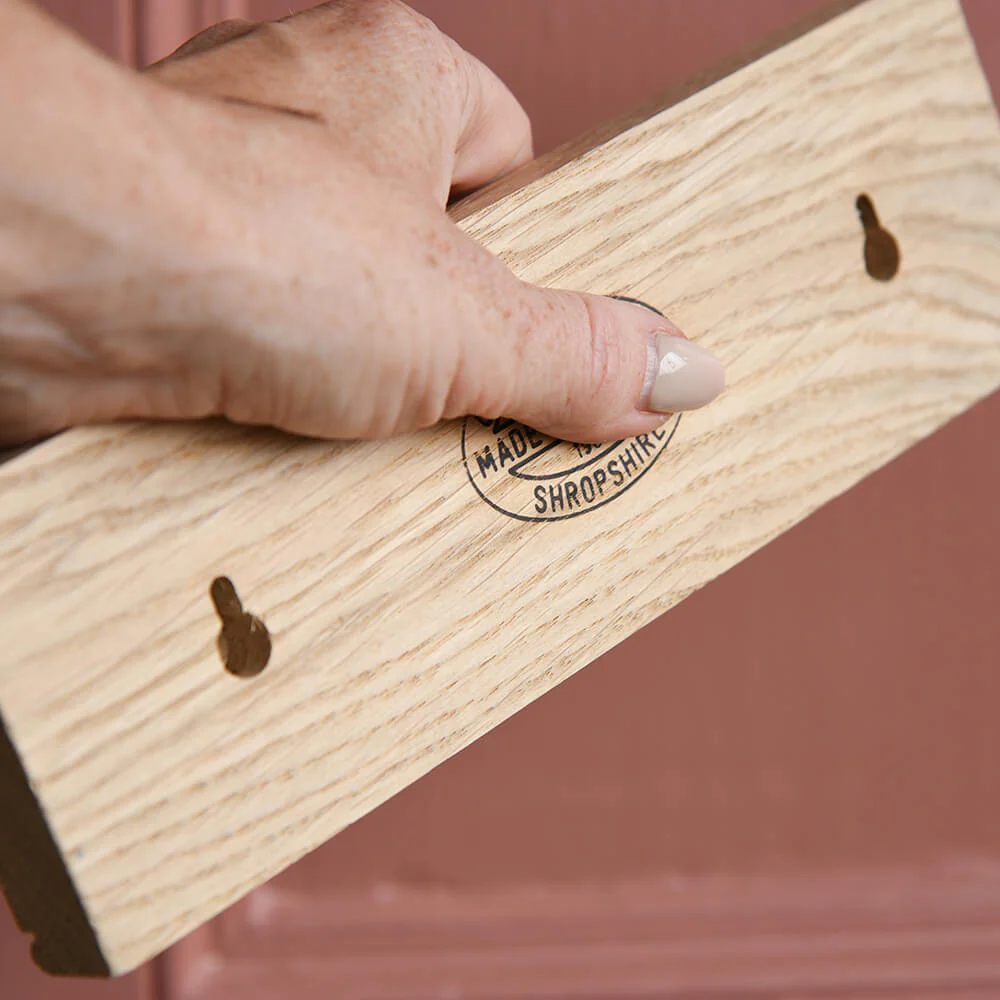 Redesigned for 2025 with aesthetically pleasing wooden pegs. Simple but very useful oak key rack. Matching our shaker style peg rails. This oak key rack has five pegs and is ideal for hanging up in the hall way so you no longer have to worry about losing those sets of keys. Also useful for hanging childrens medals!