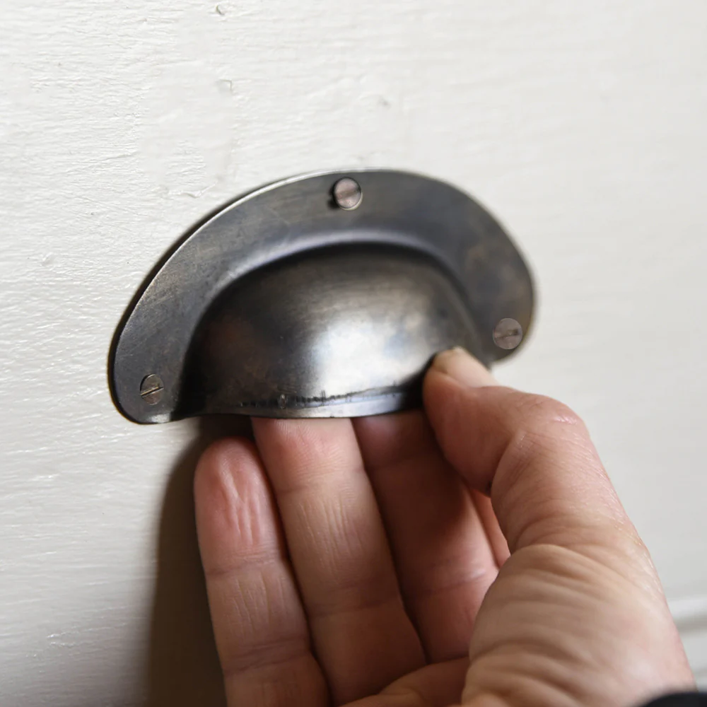 Traditional style curved drawer pull crafted from pressed brass. Although light weight, these cup handles feel sturdy and would look great on chests of drawers, trunks or even in kitchens.