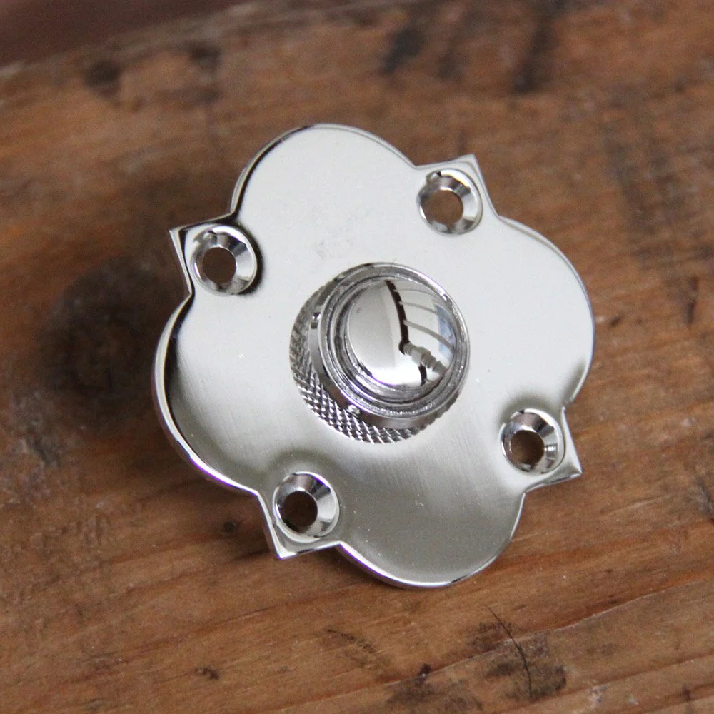 A nickel plated solid brass bell push in a traditional quatrefoil style. Stunning decorative ornamental shape that represents a flower or clover leaf traditionally used in architectural tracery. That bell press is hand made in the UK.
